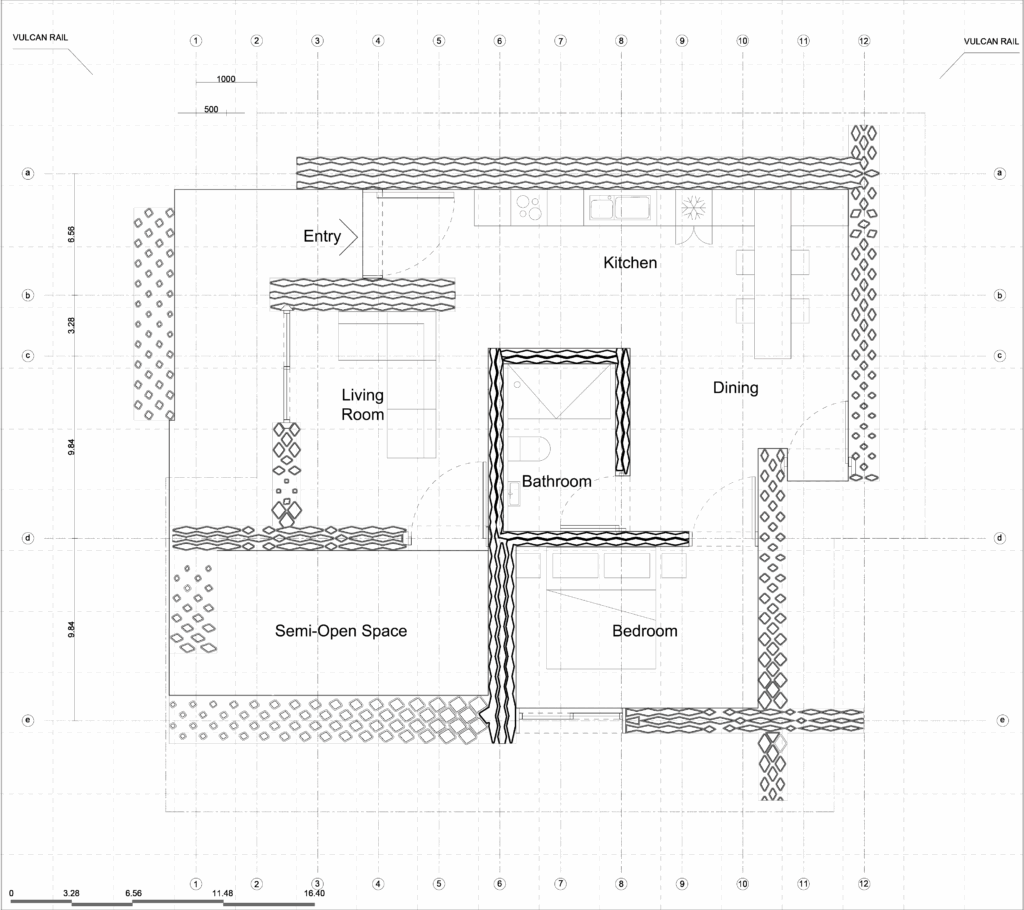 The privacy is achieved by layering walls from opaque interiors to porous exteriors. For the climate, the south walls block direct summer sun and invite refreshing breezes through small bottom openings for natural ventilation, which then escape through the insulated north wall’s top openings. Meanwhile, the east and west walls are designed to welcome soft morning and evening sunlight while bearing the roof load.