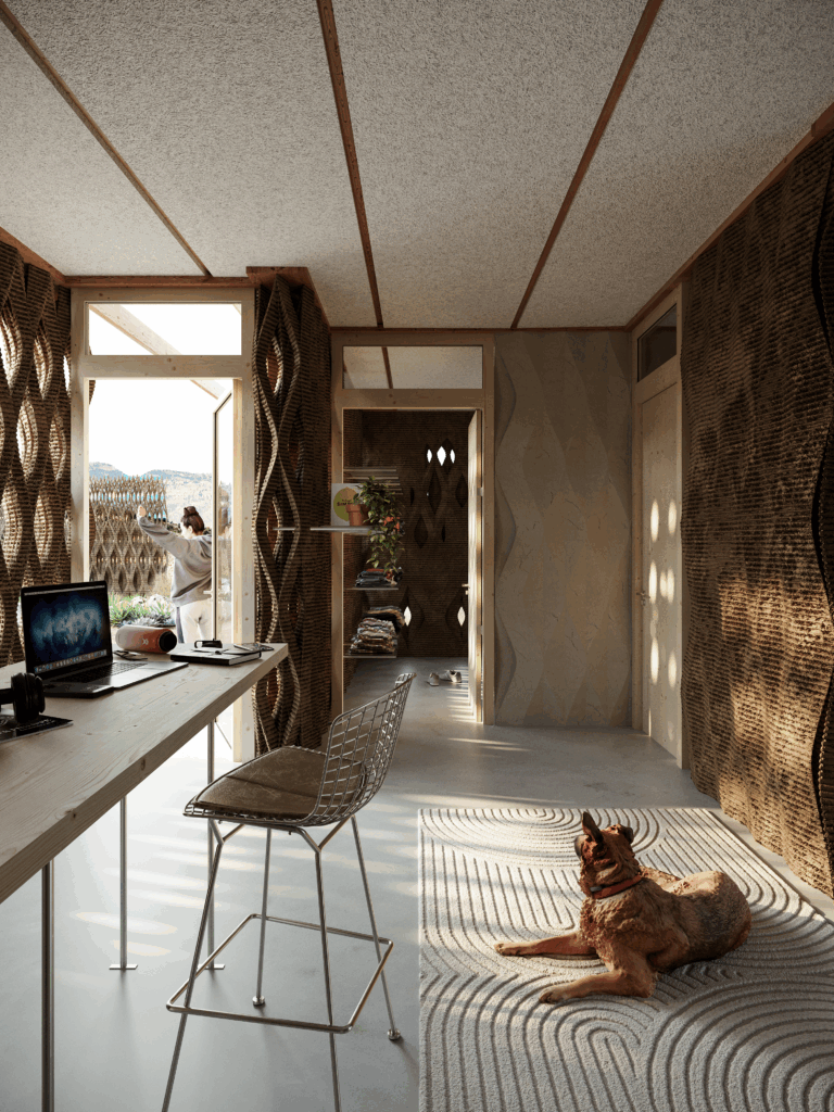 Consisting of four evolving houses that adapt to the needs of a diverse and multigenerational community, this project demonstrates that our habitat can expand in both size and functionality. The architectural innovation includes layered walls that can adapt its porosity to the different space’s requirements.The unit starts with a central core including bathrooms that feature non-porous walls for maximum privacy. The wall then transitions consistently to living spaces with varying levels of porosity, facilitating a subtle interplay of light and openness. The journey concludes in semi-outdoor spaces with high porosity, fostering an immersive connection with the surrounding environment.