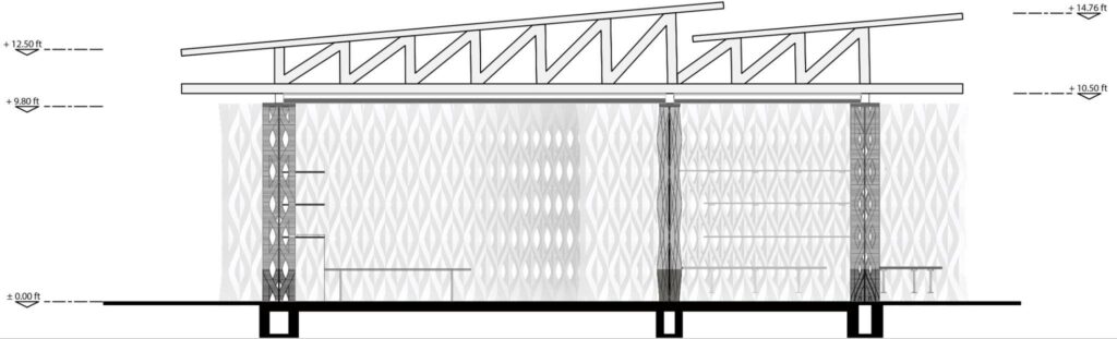 The wall cavities are designed to support other architectural elements, such a post-tensioning cable to hold the roof, metallic inserts to hold the wood furnitures and shelves as well as reservation to integrate the window frame and MEP after the walls are printed and cured.